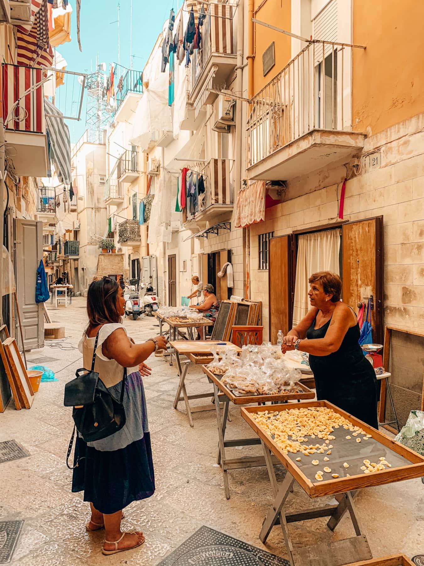 Bari vecchia, l'antico centro storico è un dedalo di vicoli di origine bizantina, costruito per disorientare i nemici. Oggi è il luogo dove è possibile osservare le massaie che preparano le orecchiette a mano, una delle tradizioni più iconiche della Puglia. Centro della vita notturna e sociale di Bari, con eventi e locali infatti è vista come il cuore della città, un luogo dove la storia si intreccia con la vita quotidiana contemporanea, tra mercati, arte e tradizioni.