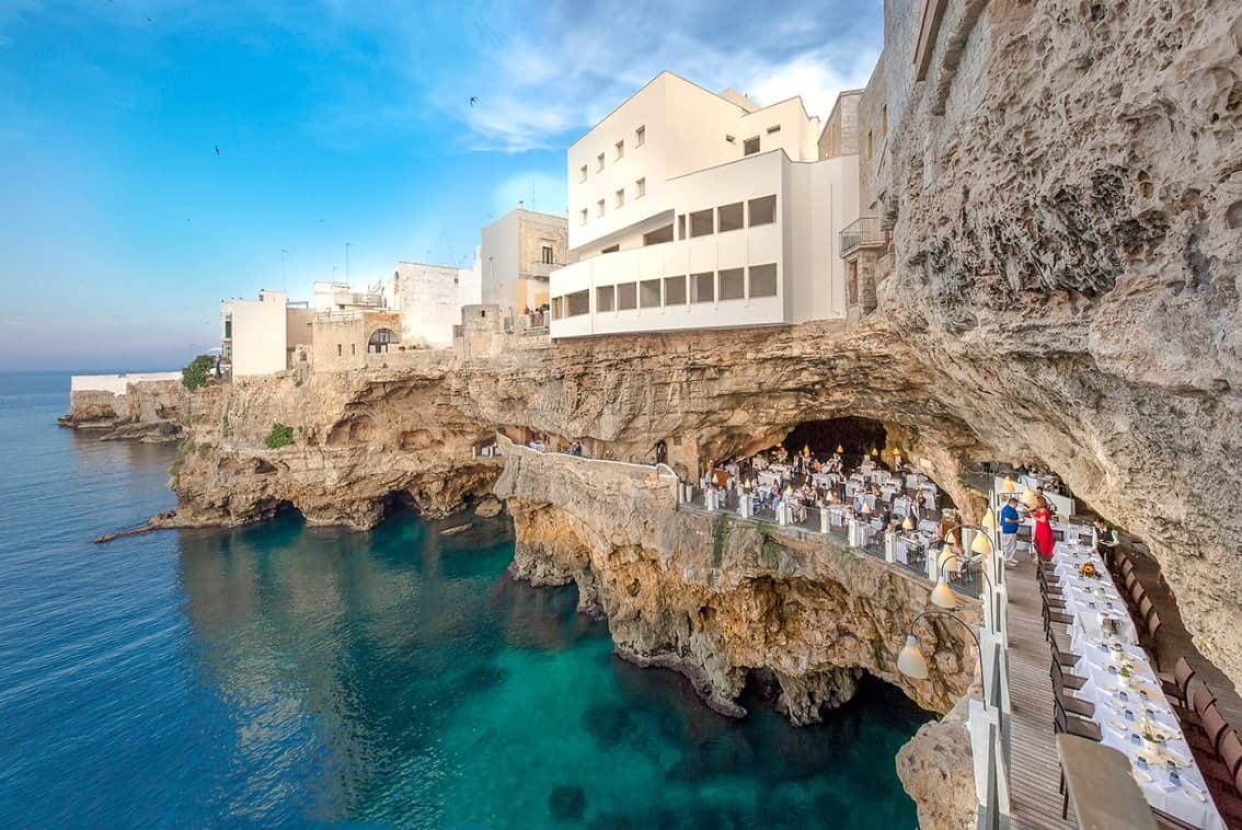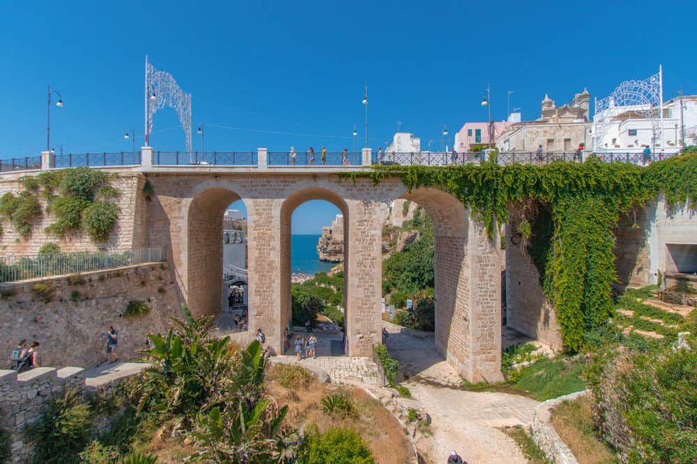 Polignano, La città è celebre per la sua bellezza naturale con scogliere a strapiombo e grotte marine - come la Grotta Palazzese e le spiagge, come la celebre Lama Monachile, uno dei punti più fotografati e iconici di Polignano, offrendo una vista panoramica spettacolare dal ponte borbonico.