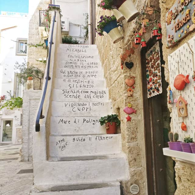 Polignano è stata nominata "città più accogliente del mondo" nel 2023, affascinante per il suo centro storico è caratterizzato da vicoli bianchi, portoni e muri decorati con citazioni poetiche.